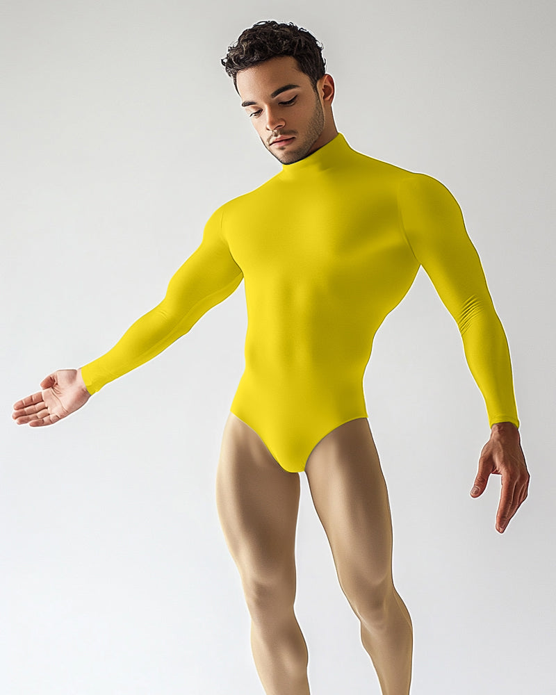 Our long sleeve mock neck leotard offers a smooth, second-skin fit with a seamless torso and invisible neckline, plus a snap closure at the gusset. Available in 30 colors, it's designed for a sleek, contoured look with comfortable flexibility.