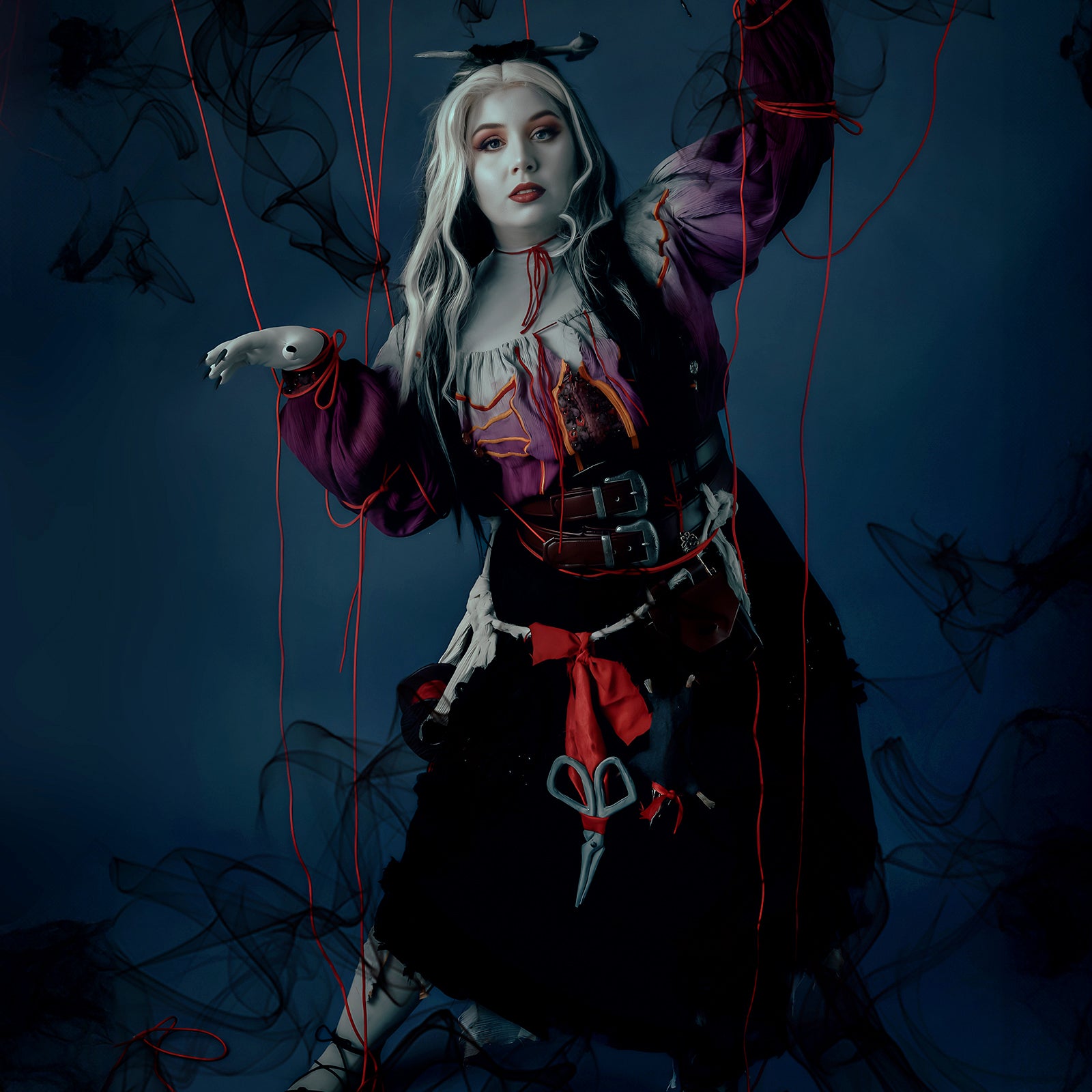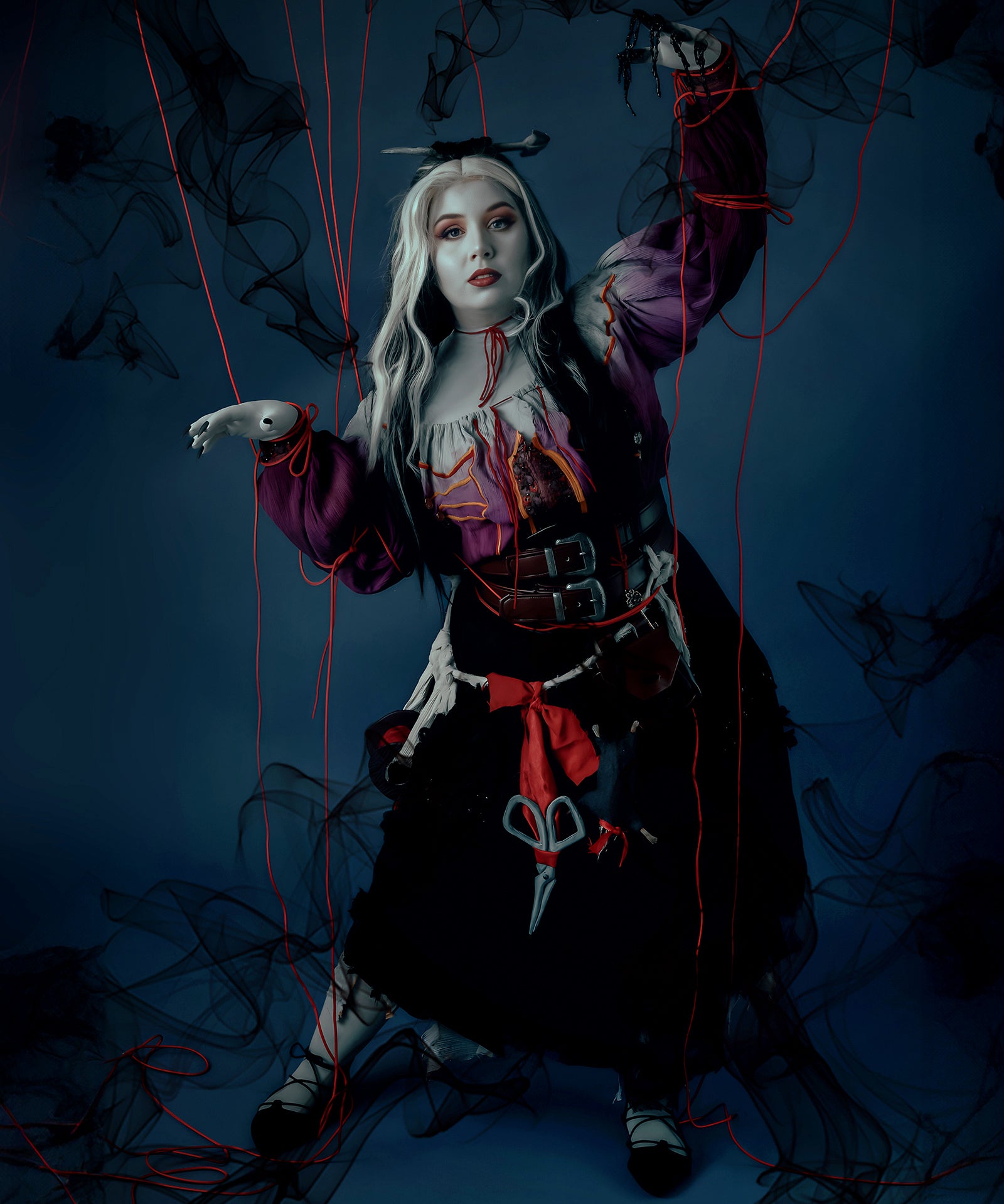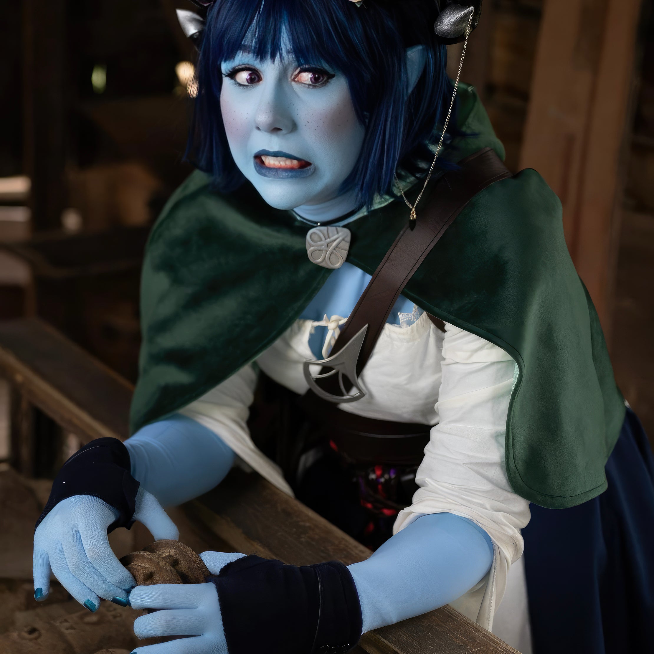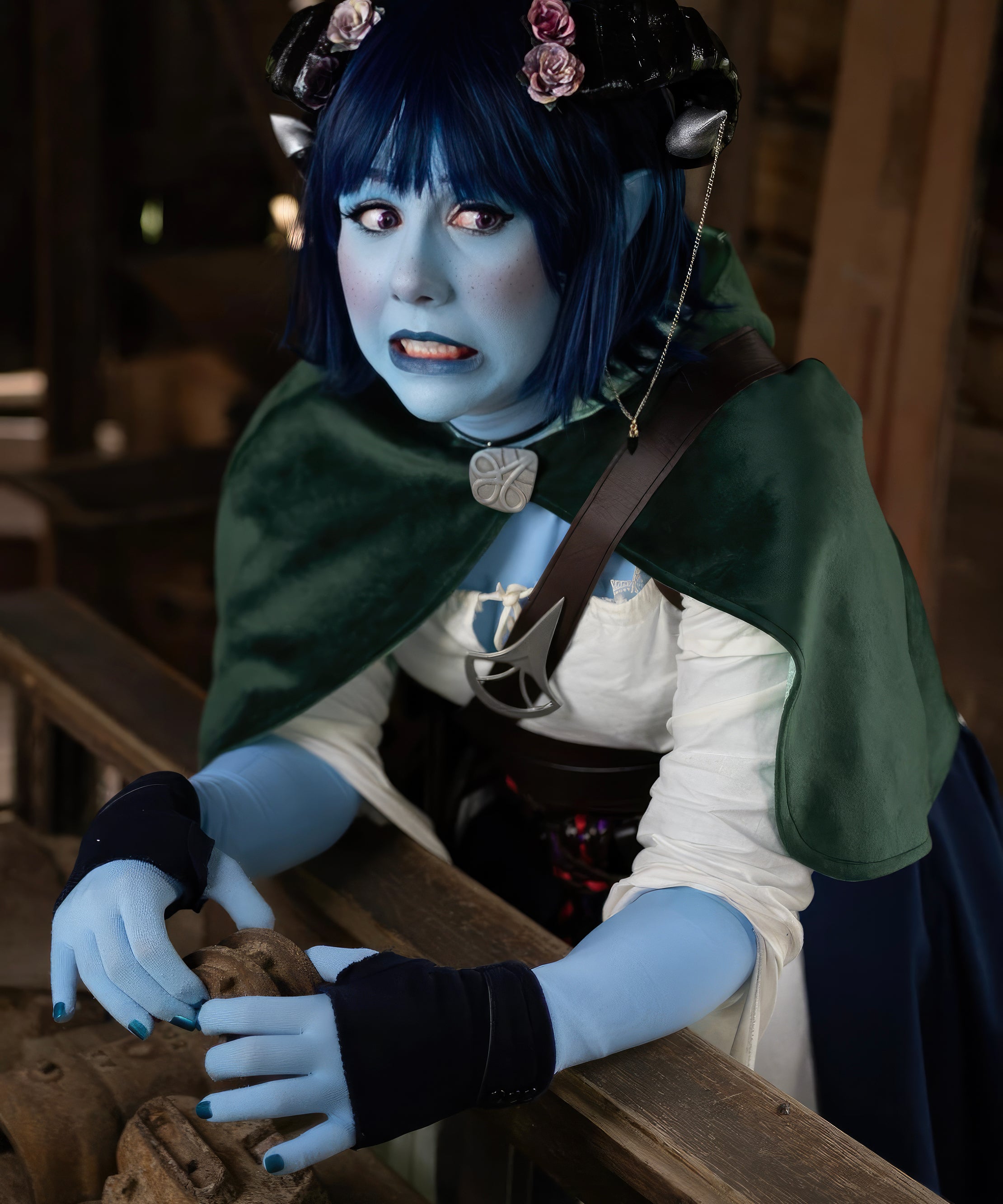 Laudna Cosplay made and worn by @taycosplayy wearing light grey seamless gloves and microfiber tights shot by @DawnElizabethPhotographer