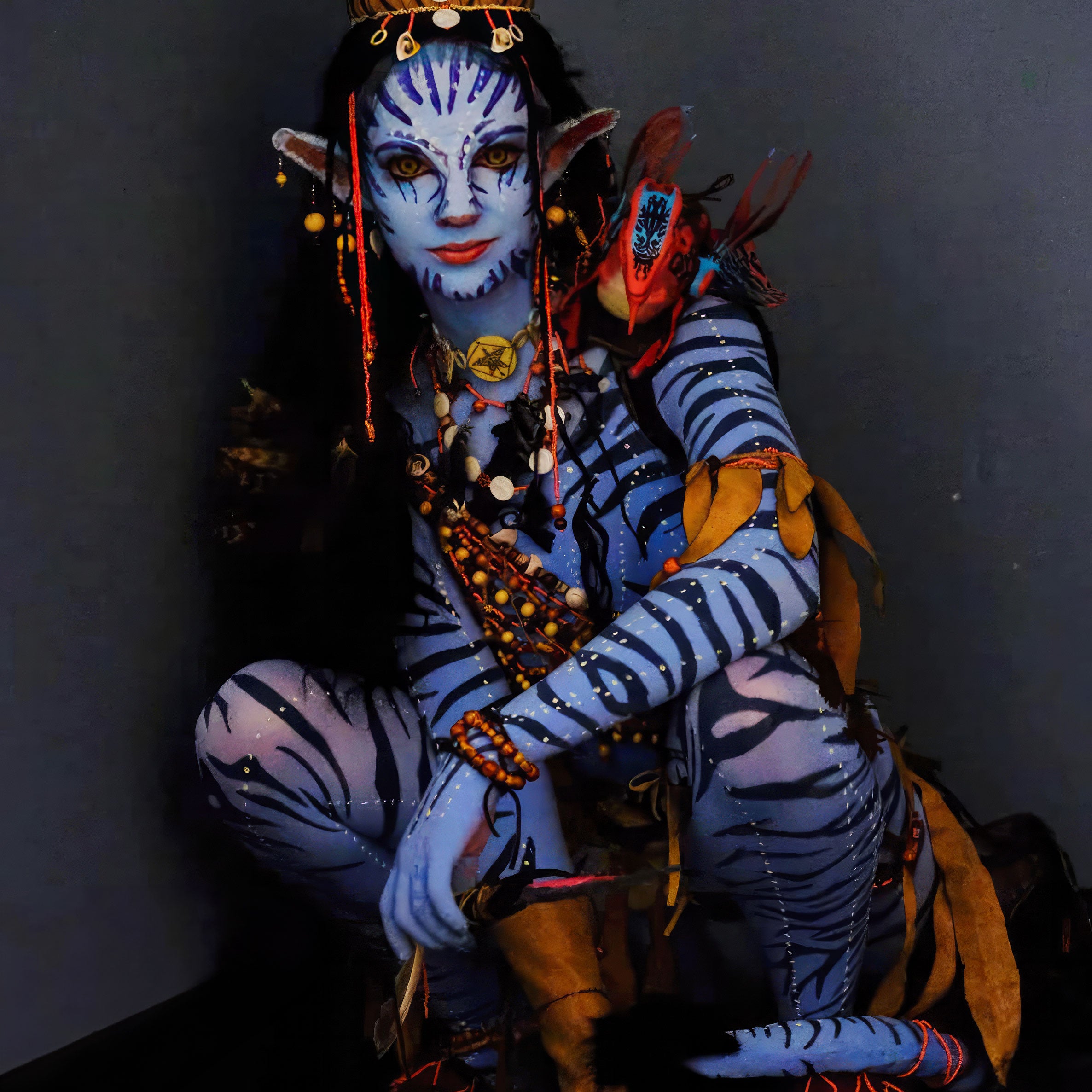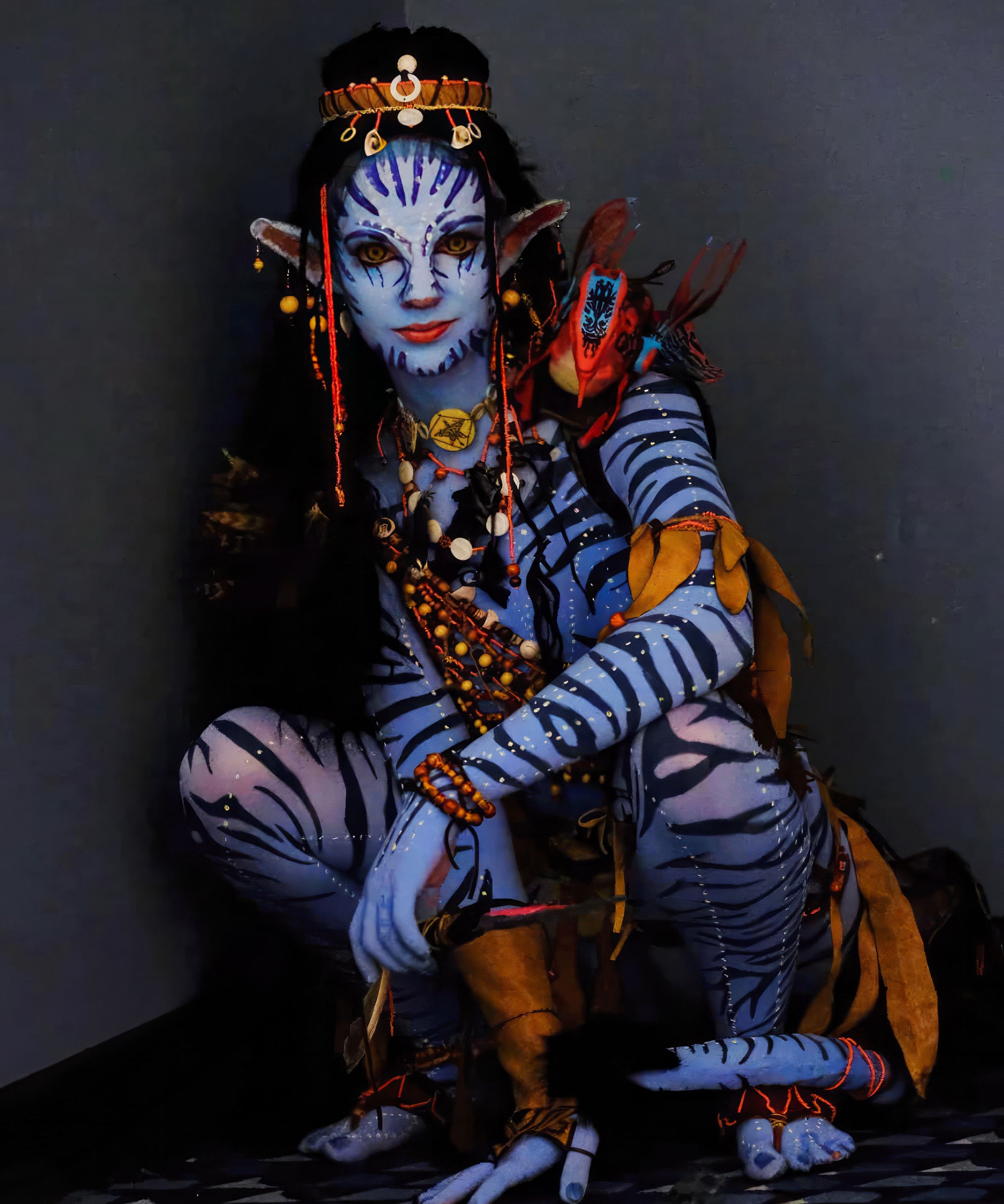 Navi Costume by cosplayer @thatlazysnail wearing sky blue mock neck leotard + seamless gloves and microfiber tights as a base hand painted by them shot by @jstapp_photography