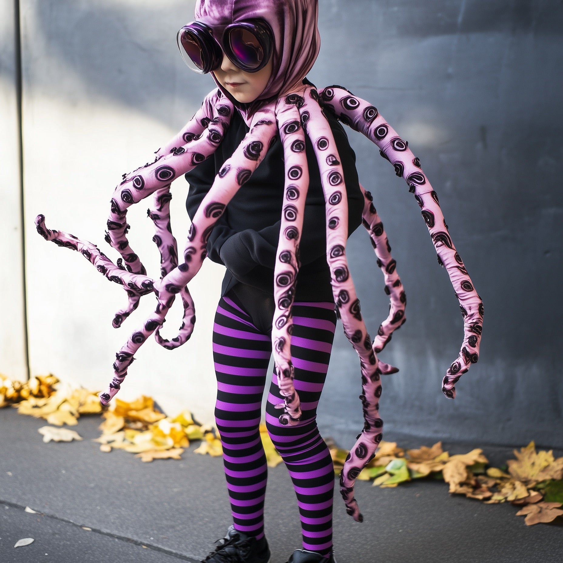 These fun purple and black striped tights are the perfect addition to any costume, like this cool octopus getup! Super comfy, warm and full of character.