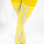 Add a little something special to your basic white tights in these cute and comfortable white striped tights. Flexible and durable these are perfect with any outfit or costume.