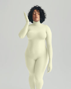 We have been working on this product for over 6 years, we finally have a fitted mock neck catsuit, seamless on the legs, torso, arms and fingers. It features a 5 inches seam on the shoulders to make it fit like a second skin. The catsuit has a 20 inches white invisible zipper that can be worn to the front or the back depending on your needs. This is a footed version, toes are individually covered , the knitting of this suit allows you to cut wherever you need without running into run issues, pun intended.