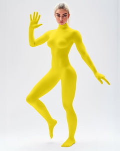 We have been working on this product for over 6 years, we finally have a fitted mock neck catsuit, seamless on the legs, torso, arms and fingers. It features a 5 inches seam on the shoulders to make it fit like a second skin. The catsuit has a 20 inches white invisible zipper that can be worn to the front or the back depending on your needs. This is a footed version, toes are individually covered , the knitting of this suit allows you to cut wherever you need without running into run issues, pun intended.