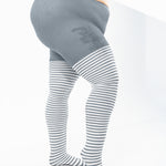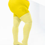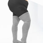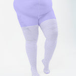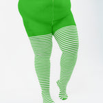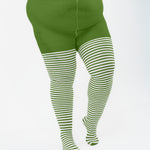 Our White striped tights come in 3 different sizes, these are perfect for a mix and match pattern outfit to add texture and dimension. As a best seller during the Holidays, you can dress up as a candy cane wearing red and white tights, or be Santa's helper elf with the green and white stripes. The stripes begin at the upper thigh and continue down the leg with the upper part remaining a single solid color.