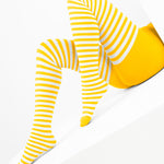 Our White striped tights come in 3 different sizes, these are perfect for a mix and match pattern outfit to add texture and dimension. As a best seller during the Holidays, you can dress up as a candy cane wearing red and white tights, or be Santa's helper elf with the green and white stripes. The stripes begin at the upper thigh and continue down the leg with the upper part remaining a single solid color.