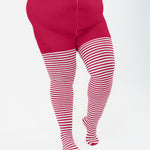 Our White striped tights come in 3 different sizes, these are perfect for a mix and match pattern outfit to add texture and dimension. As a best seller during the Holidays, you can dress up as a candy cane wearing red and white tights, or be Santa's helper elf with the green and white stripes. The stripes begin at the upper thigh and continue down the leg with the upper part remaining a single solid color.